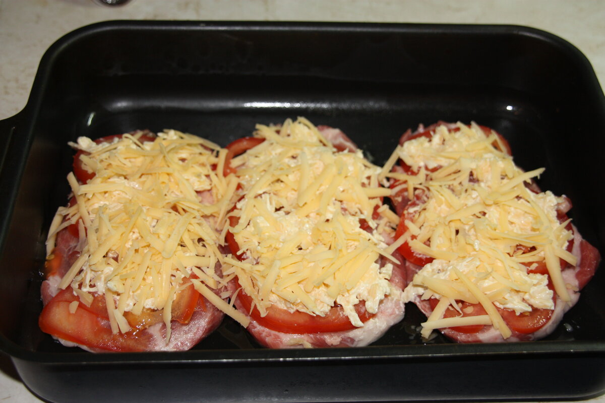 Вкусная свиная шейка, запеченная с помидорами и сыром. Рецепт состоит из семи шагов: