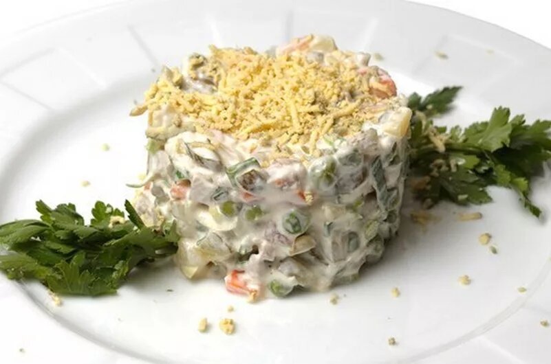 Для украшения салата можно использовать петрушку, зеленый лук и яйцо. Если вы хотите добавить какой-то новый вкус, можете попробовать добавить говядину или яблоки.
