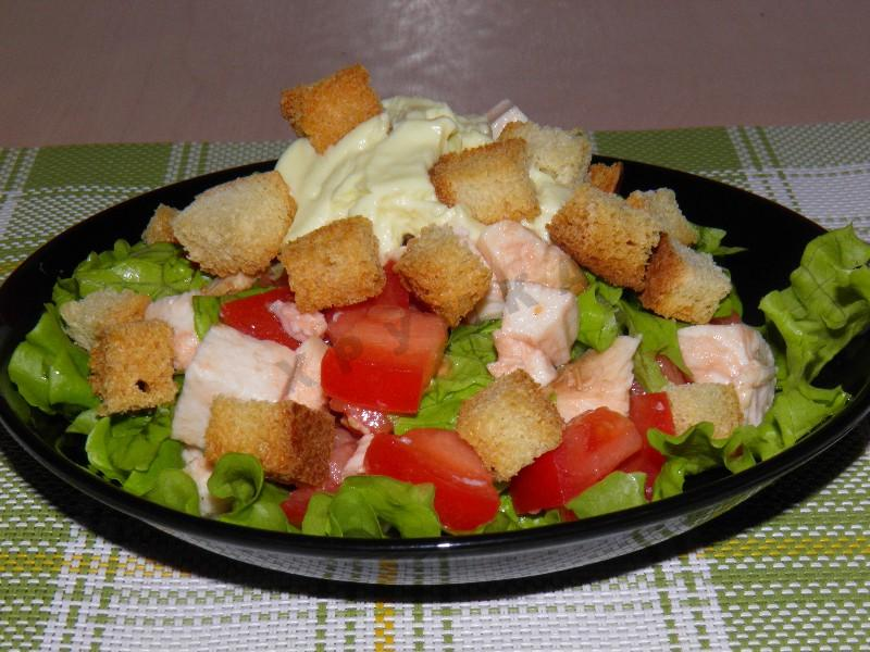 Вот готовый салат с помидорами, плавлеными сырками и сухариками: