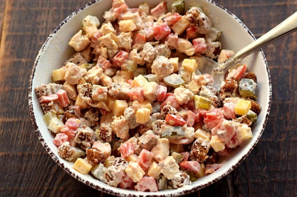 Салат с помидорами, плавлеными сырками и сухариками - это классический салат, который может быть приготовлен за несколько минут. Он состоит из свежих помидоров, плавленого сыра, ржаных сухариков и мелко нарезанной зелени. Вам не нужно добавлять дополнительные ингредиенты, чтобы сделать его более интересным.