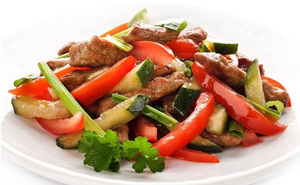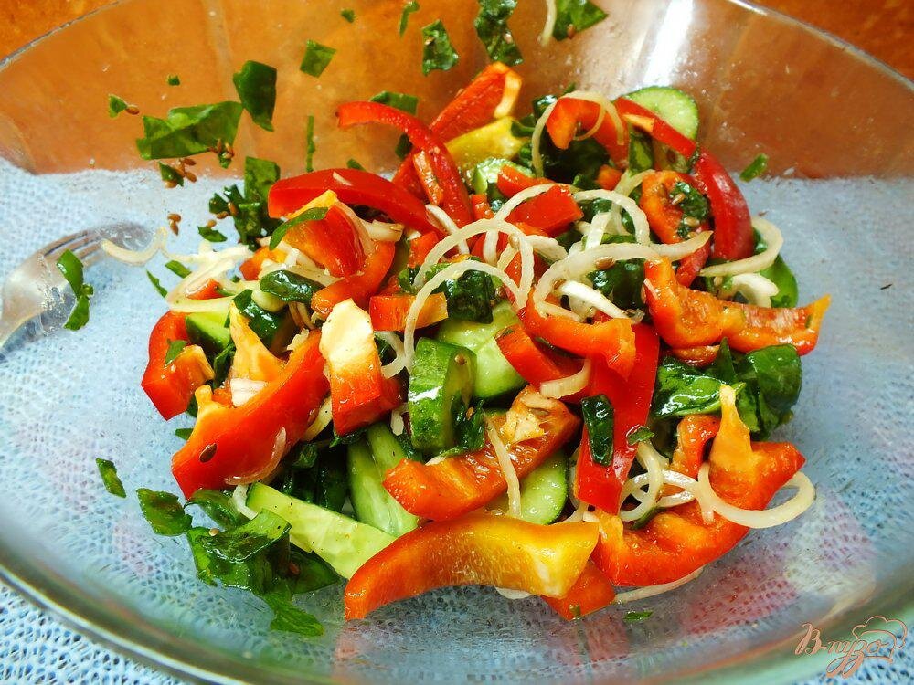 Быстрый салат из сладкого перца с помидорами в ароматном соусе. Ингредиенты: 3 сладких перца, 6 помидоров, 2 луковицы. Салат готовится быстро и вкусно, его можно подавать как закуску или основное блюдо.