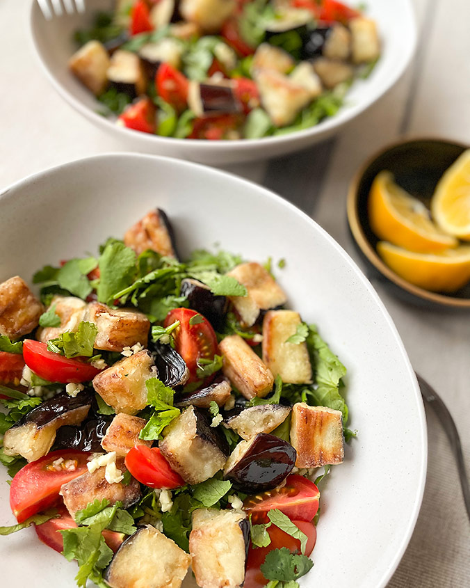 Вначале необходимо обжарить баклажаны в соли до хрустящей консистенции. Затем нарезать их на кусочки и смешать с измельченными помидорами, чесноком, сыром и зеленью. Заправить салат оливковым маслом и солью.