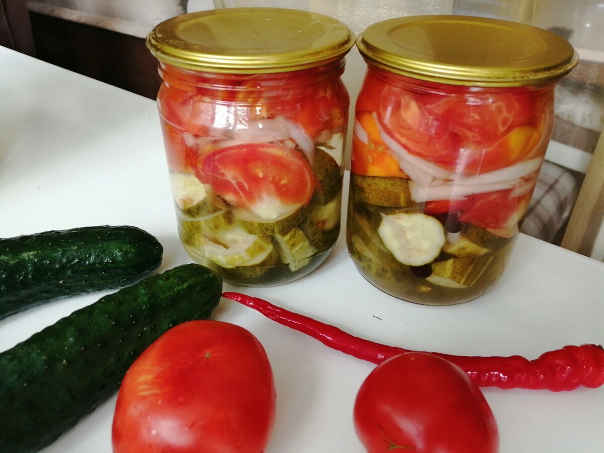 Для начала, приготовьте необходимые ингредиенты: огурцы, помидоры, болгарский перец, лук, соль, сахар, уксус. Затем маринуйте огурцы в смеси из воды, уксуса, сахара и соли.
