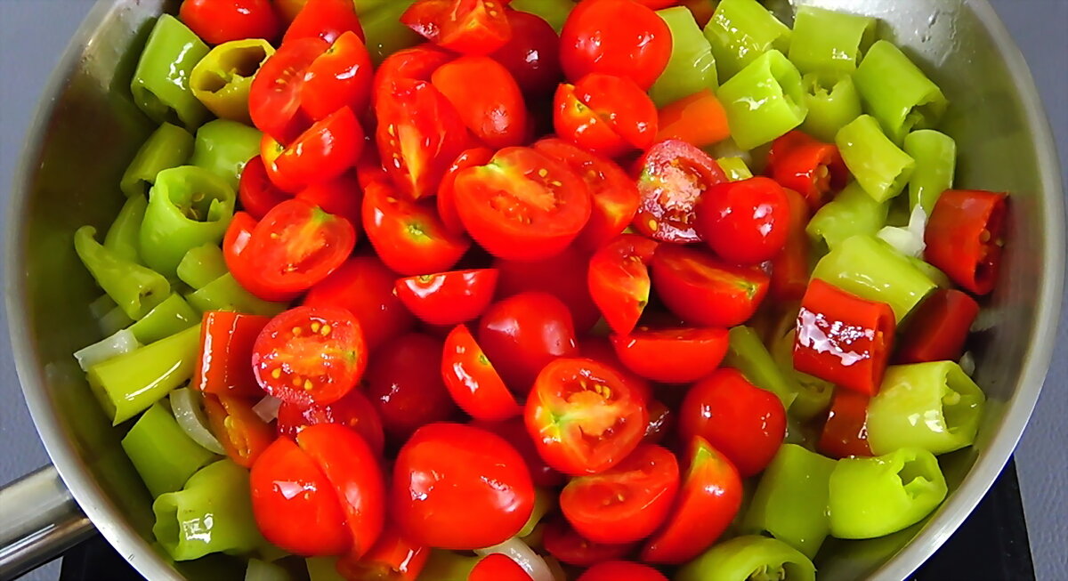 - Помидоры и сладкий перец нарезать на маленькие кусочки.