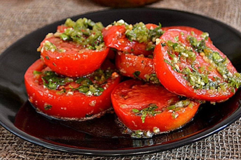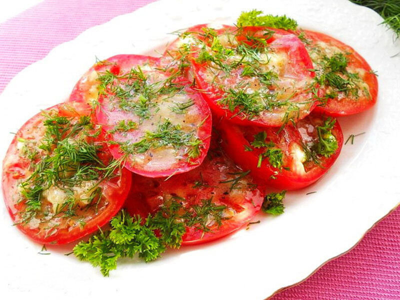 Свежие помидоры, фаршированные чесноком, подают на закуску. Для приготовленияNeeded: помидоры, чеснок, соль, сахар. Шаги:
