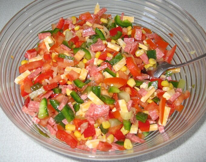- Сложите колбасу с помидорами, сыром и огурцами в салатник.