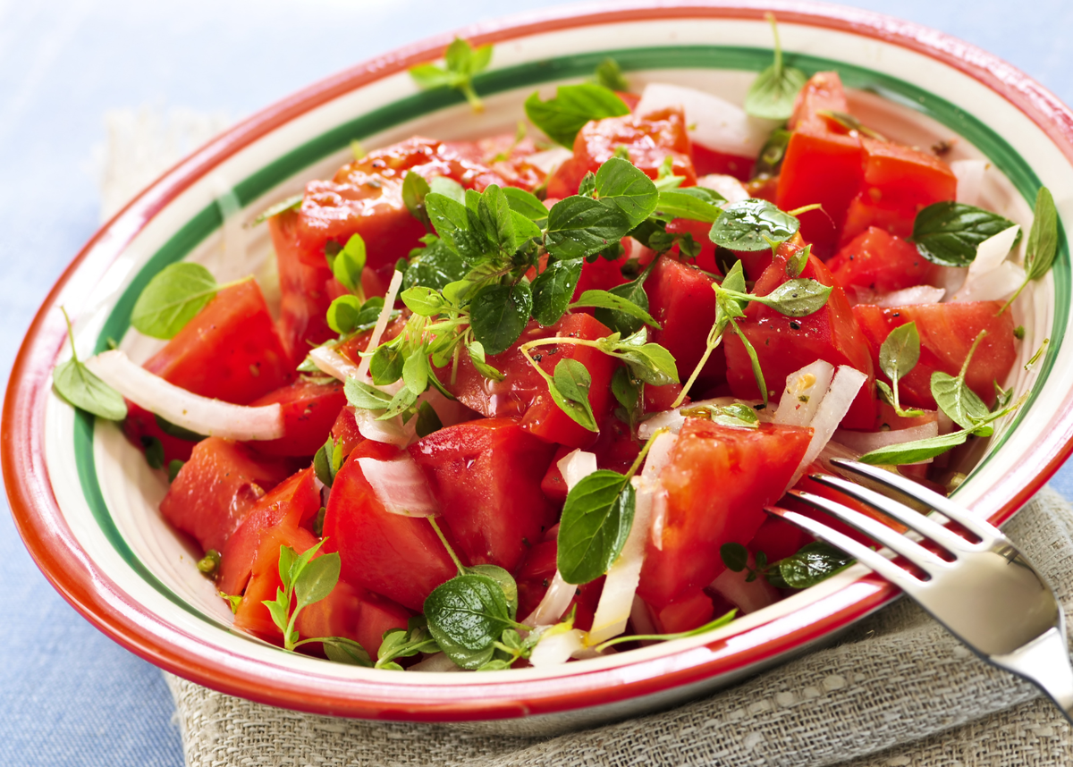 Третьим рецептом является салат с красным луком и солеными помидорами. Для его приготовления необходимо нарезать помидоры и красный лук, смешать их с кунжутом и заправить оливковым маслом и солью.