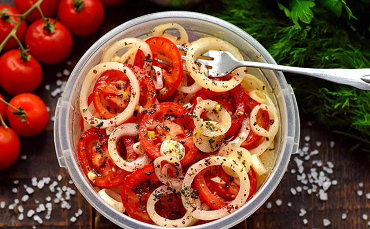 Начнём с классического рецепта салата из солёных помидоров и лука. Для его приготовления необходимо нарезать помидоры и лук, затем смешать их с майонезом и заправить солью и перцем.