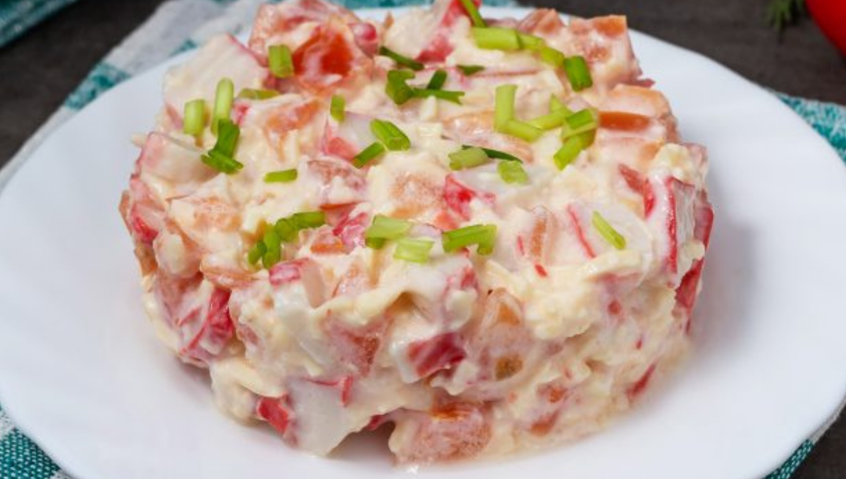 Вот простой и вкусный рецепт салата с крабовыми палочками, помидорами и сыром!