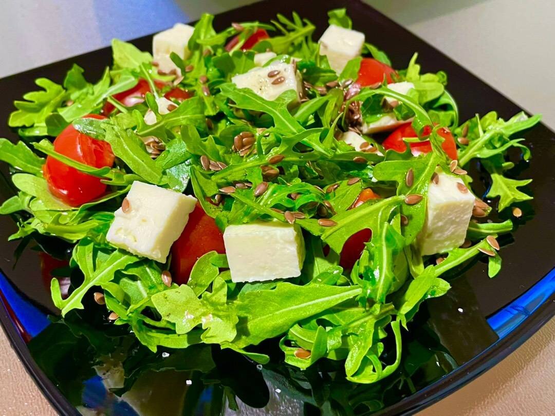Также можно приготовить греческий салат с фетаксой и маслинами. Для этого вам необходимы следующие ингредиенты: листья рукколы, помидоры, сыр фета, маслины, масло и соль.