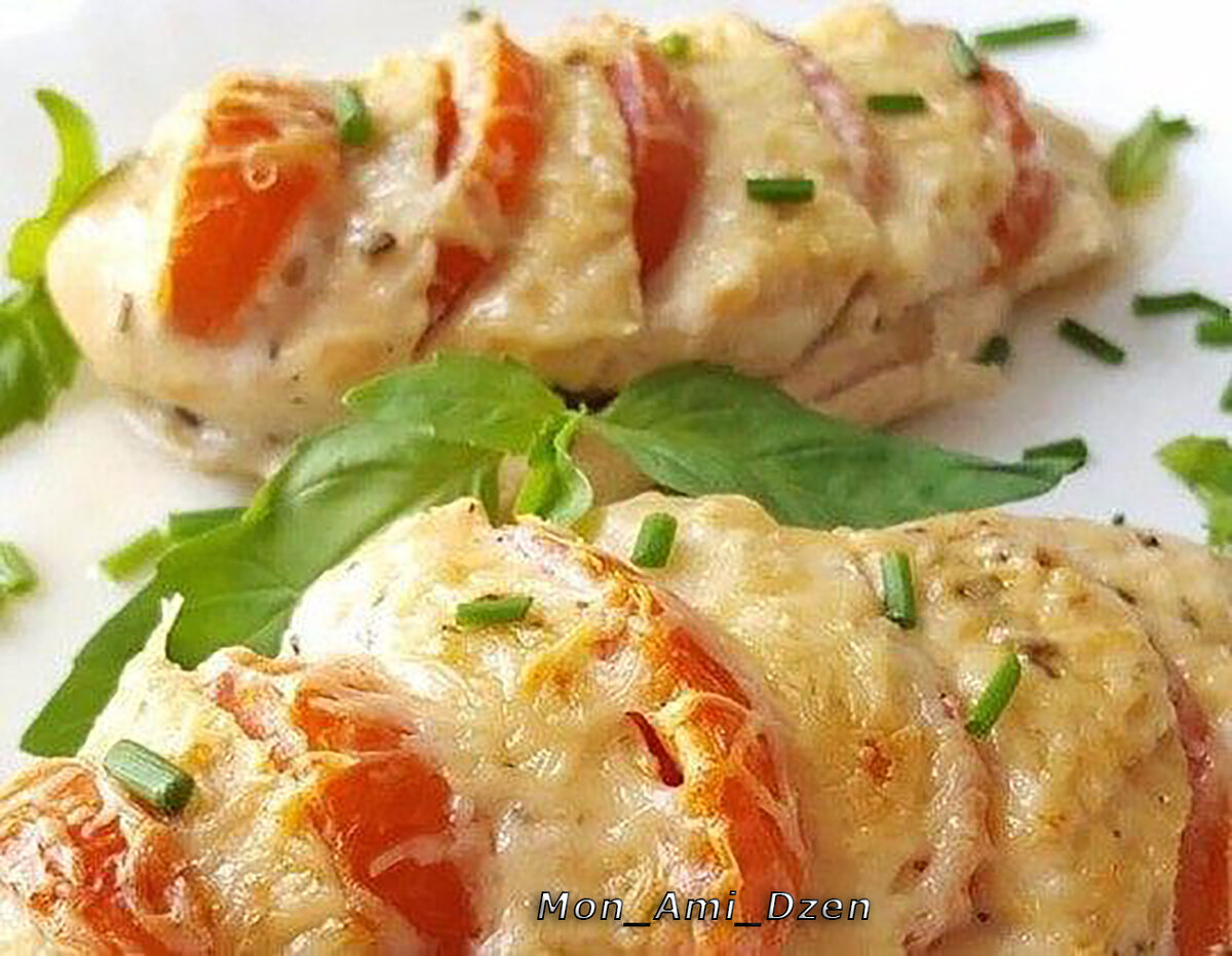 Шаг 4: Уложите куриное филе поверх помидоров и сыра.
