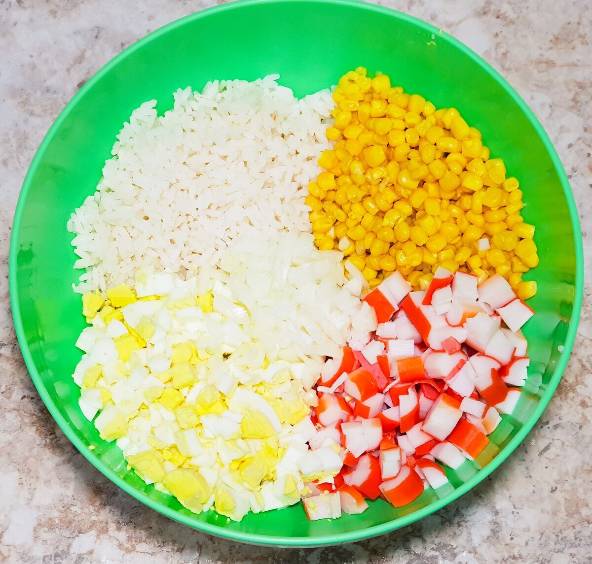- Cut the cucumbers and corn into small pieces and add them to the bowl with the crab sticks.