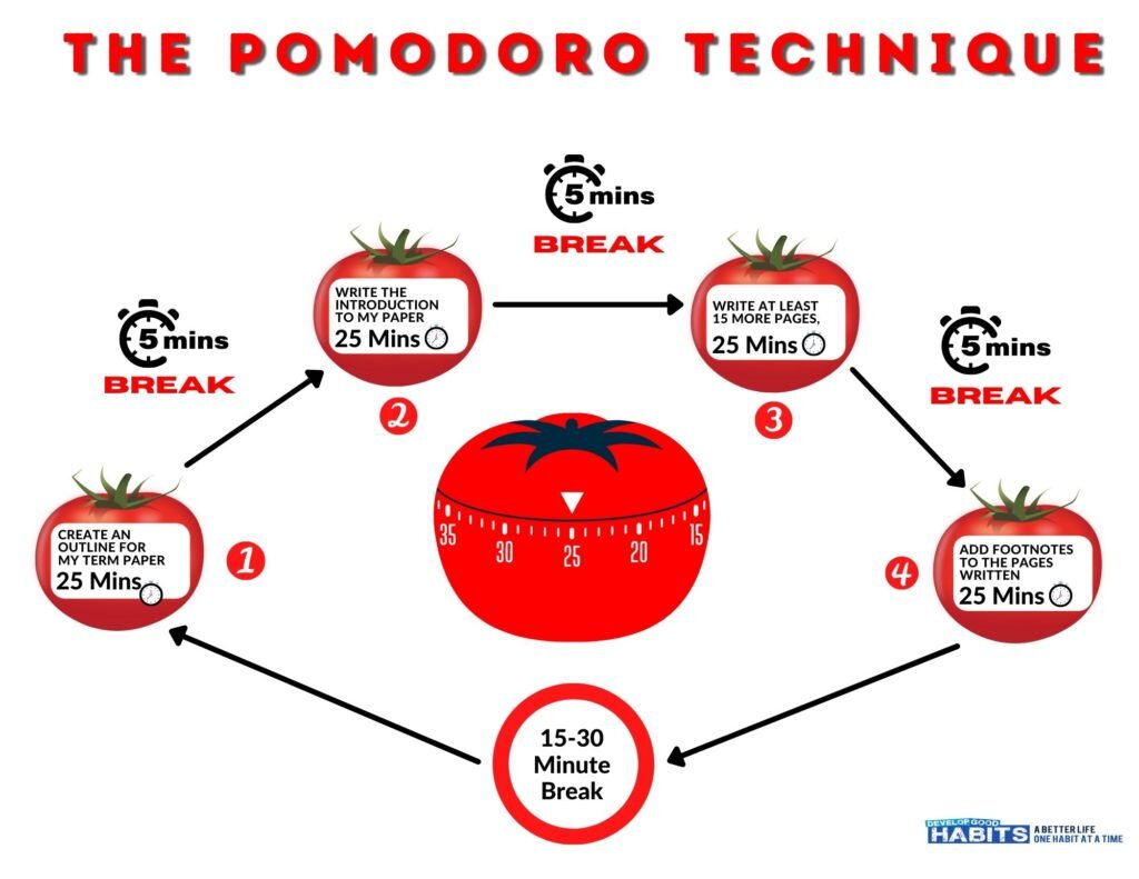 - Используйте технику Помодоро: делите задачи на маленькие интервалы времени (25 минут) и делайте перерывы между ними.