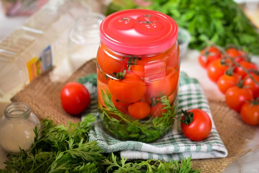 Наконец, разложите помидоры по банкам и закройте их крышкой. Уберите банки в холодильник на 24 часа, чтобы помидоры полностью заготовились.