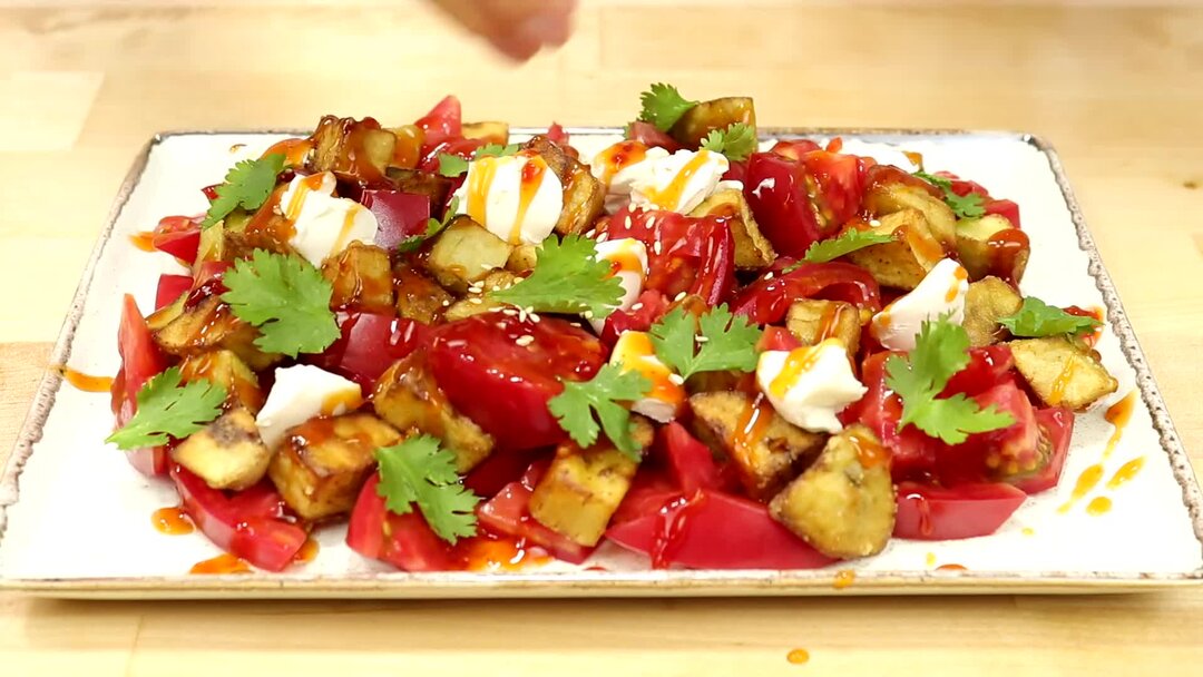 Салат с хрустящими баклажанами и помидорами - классика паназиатской кухни. Для его приготовленияneed фаршированные фетой и помидорами баклажаны, которые затем обжаривают в крахмале. В салат добавляют также жареные помидоры, сыр и зелень. Заправка из соевого соуса, сахара и грейпфрутового сока обеспечивает гармоничный вкус. Это простой и вкусный салат для любителей азиатской кухни.