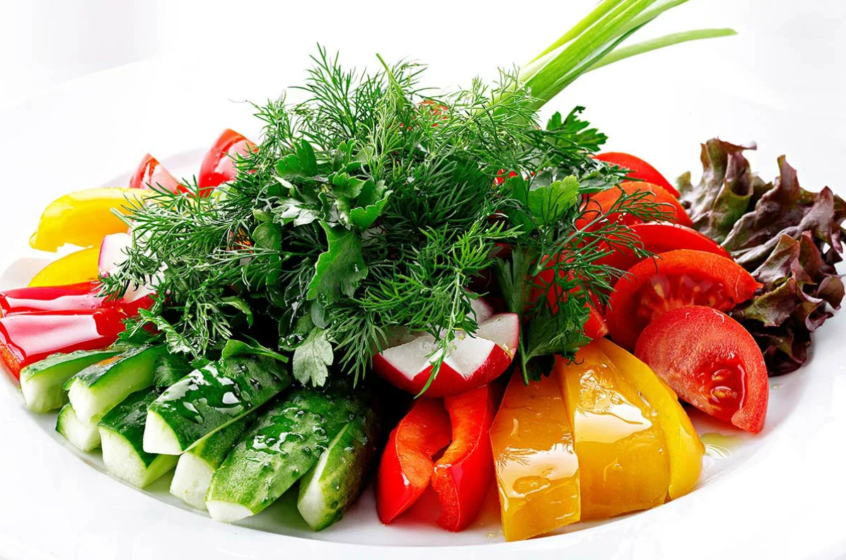 - Овощи разной формы и цвета: огурцы, помидоры, перец, лук, зелень.