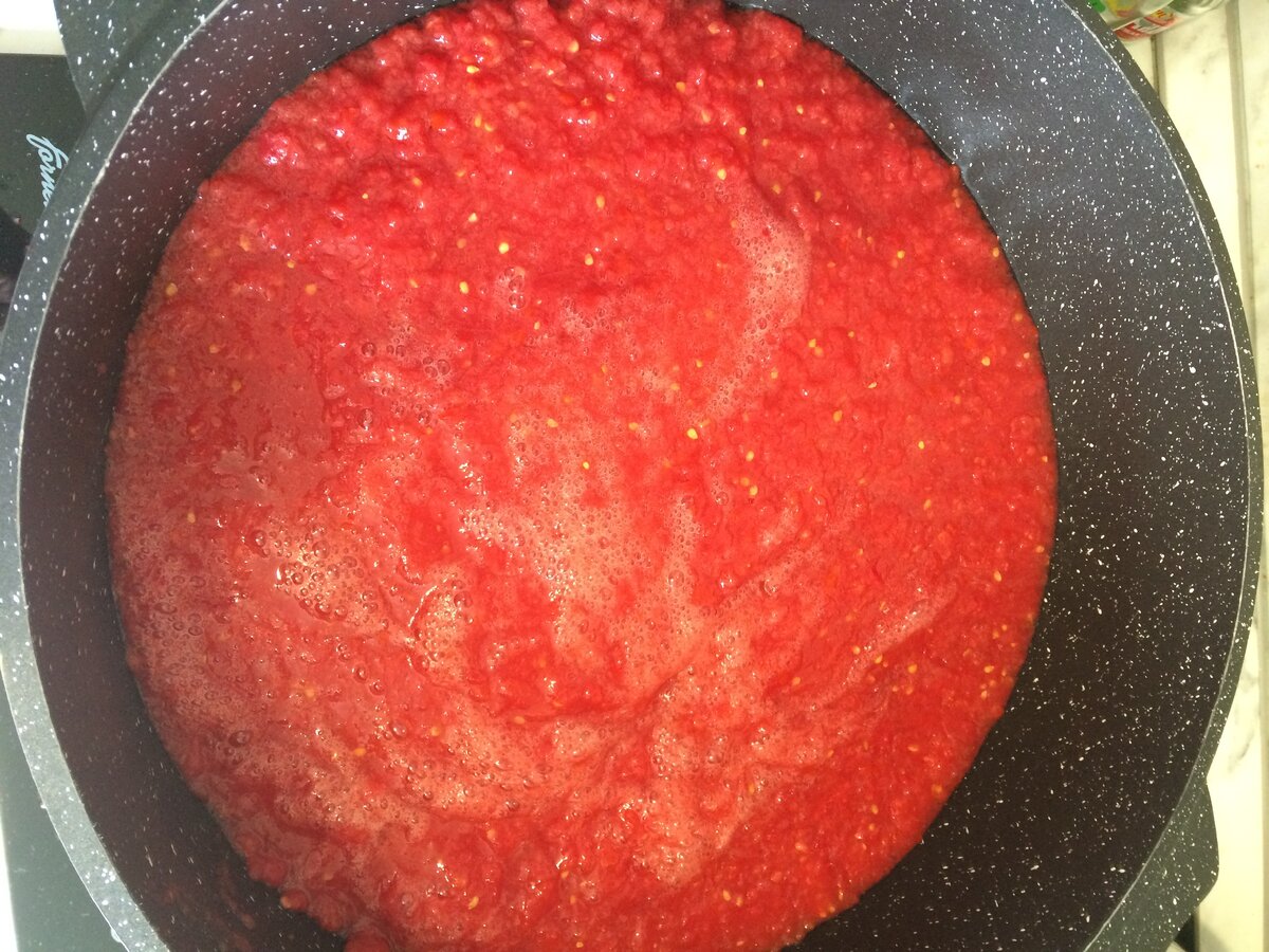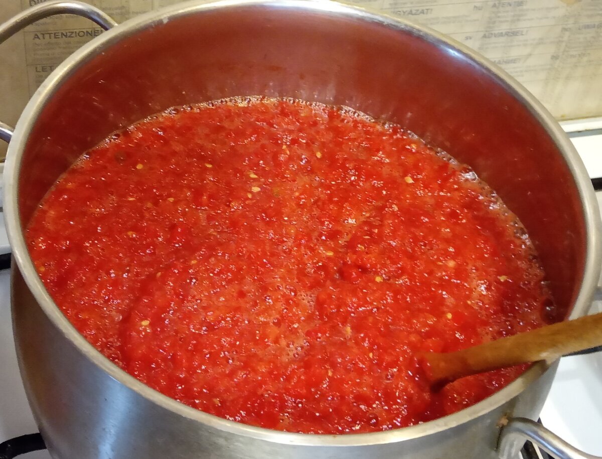 Варить томаты с перцем можно не более 30 минут. Для этого необходимо нарезать помидоры, сложить их в кастрюлю и залить водой. Добавить соль, сахар и перец, после чего все варить на медленном огне до готовности. Затем томаты нужно протереть через сито или мясорубку, а полученный сок оставить для использования в дальнейшем. Остальные помидоры можно использовать для приготовления других блюд.