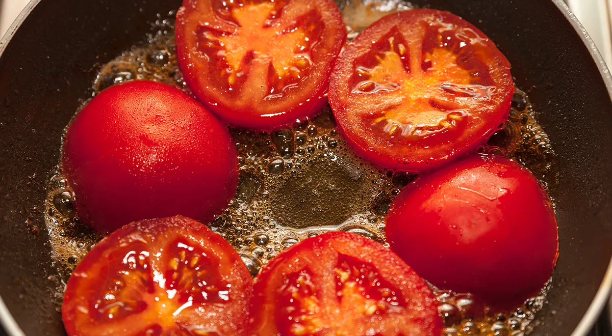 Next, heat a skillet with some oil over medium heat. Add the sliced or cubed tomatoes and cook until they are tender and lightly browned. This will take about 10-15 minutes, depending on the size of your tomatoes.