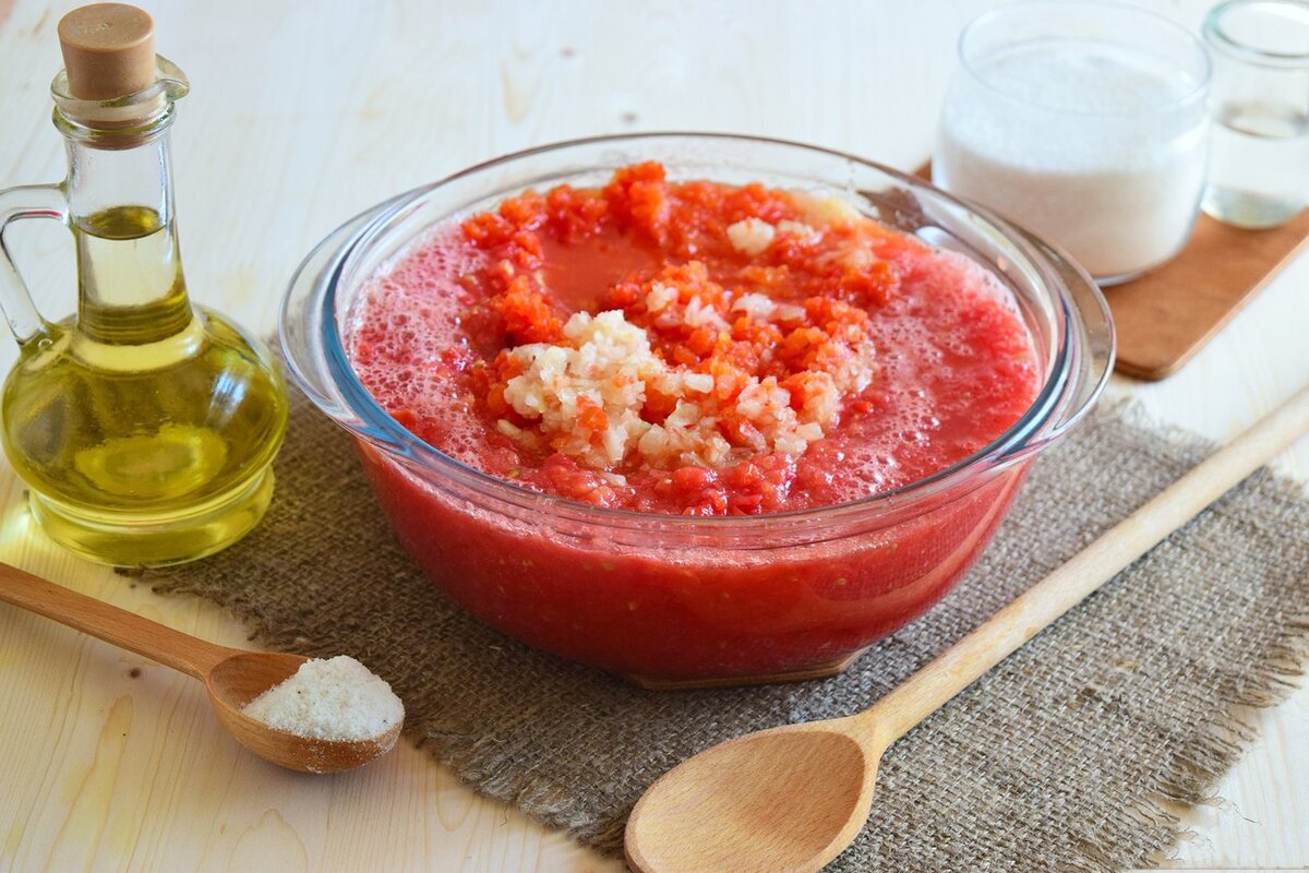 Для начала вам нужно приготовить томатную пасту. Для этого вымойте и обрежьте 2 кг помидоров, затем пропустите их через мясорубку или blender. В полученной смеси добавьте 1 головку лука, нарезанного мелко, 2 болгарских перца, нарезанных кольцами, и 1 яблоко, нарезанное мелко.